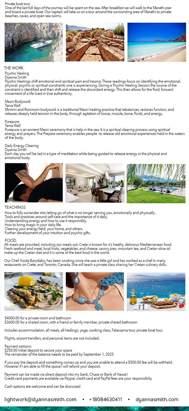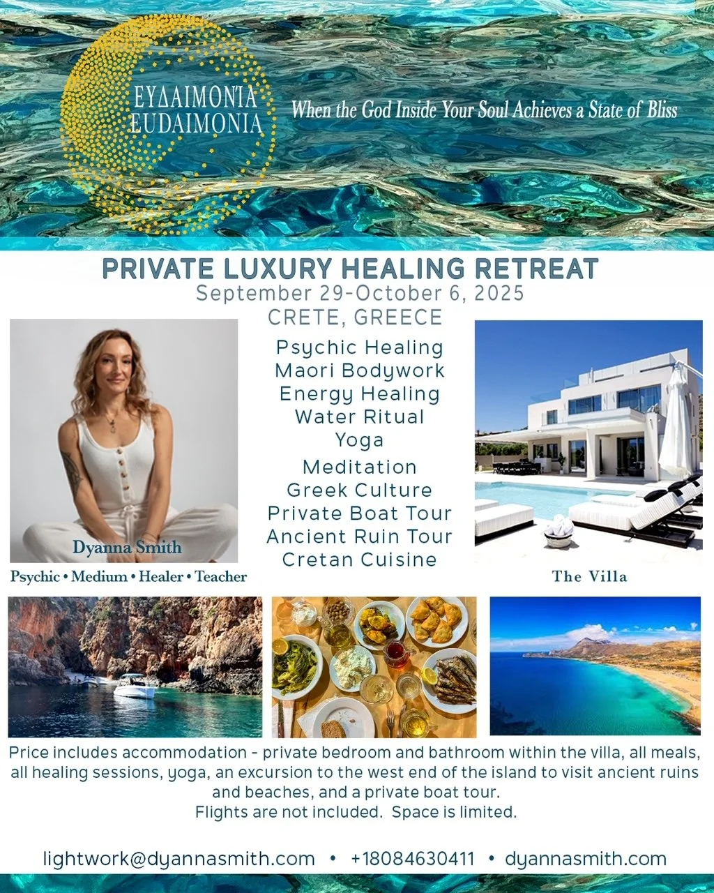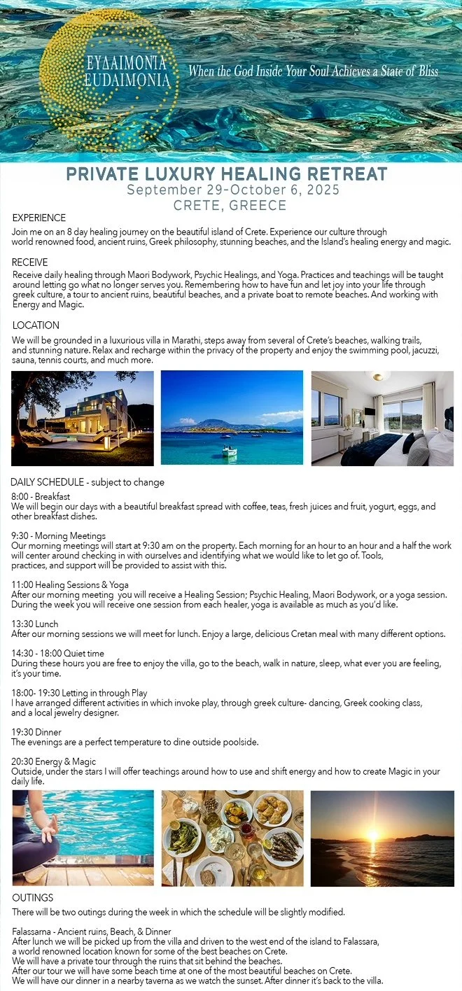 Escape to the island of Crete for an intimate 8-day Private Luxury Healing Retreat designed to restore your body, mind, and spirit through a blend of ancient traditions and modern wellness practices. Set within a stunning private villa in Marathi, this transformative experience includes daily healing sessions in psychic energy work, Maori bodywork, yoga, and meditation, along with excursions to ancient ruins, pristine beaches, and a private boat tour of Crete’s hidden coves. Nourish yourself with chef-prepared Cretan cuisine, reconnect with nature through ritual and ceremony, and enjoy the serenity of a villa complete with pool, jacuzzi, and sweeping sea views. This is your invitation to let go, reset, and rediscover joy through the beauty, magic, and wisdom of Greece.